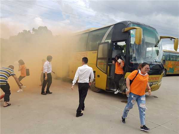 下午4时整,演练正式开始,演练假设:旅游巴突然故障起火,情况危急。现场应急处置:司机立即拨打 “110”报警,同时报告公司;导游组织游客迅速撤离到安全地带,同时启动应急灭火疏散预案。游客在导游和司机的带领及指引下,按照逃生路线从前后车门或逃生窗口或安全车窗有序撤离逃生。撤离到安全地带后导游及时清点人数报告公司,同时协助到场的医护人员对受伤游客进行及时救治。司机导游在现场实地使用了灭火器进行扑救,确保所有一线服务人员掌握消防灭火器的使用及旅游大巴的应急逃生方法。