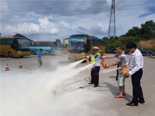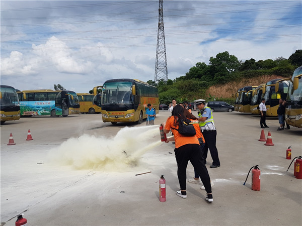 为做好暑假旅游团队的安全保障,令广大市民安心、放心出游, 6月27日下午,在江门市蓬江区交警等部门的直接指导下,江门市大中旅游汽车服务有限公司和江门大方导游服务有限公司在大中公司本部联合举办了旅游大巴应急逃生及消防演练,当天未有出团任务的导游司机共五十多人参加了本次演练。