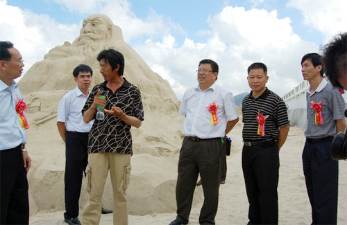 国际沙雕艺术家张永康向李崴副市长一行领导介绍沙雕情况 |