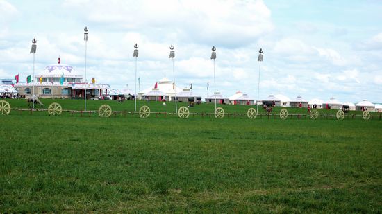 白色在当地看来是纯洁与平安的象征。与白色结缘的东西,即使是未曾与呼伦贝尔谋面的人也能历历道来:抑或是绿色海洋中那帆船般的蒙古包,抑或是那奔跑中的羊群,抑或是那圣洁的哈达,抑或是那一日三餐中都不能缺少的白食。可是,怎么能少了冬季那达慕呢。