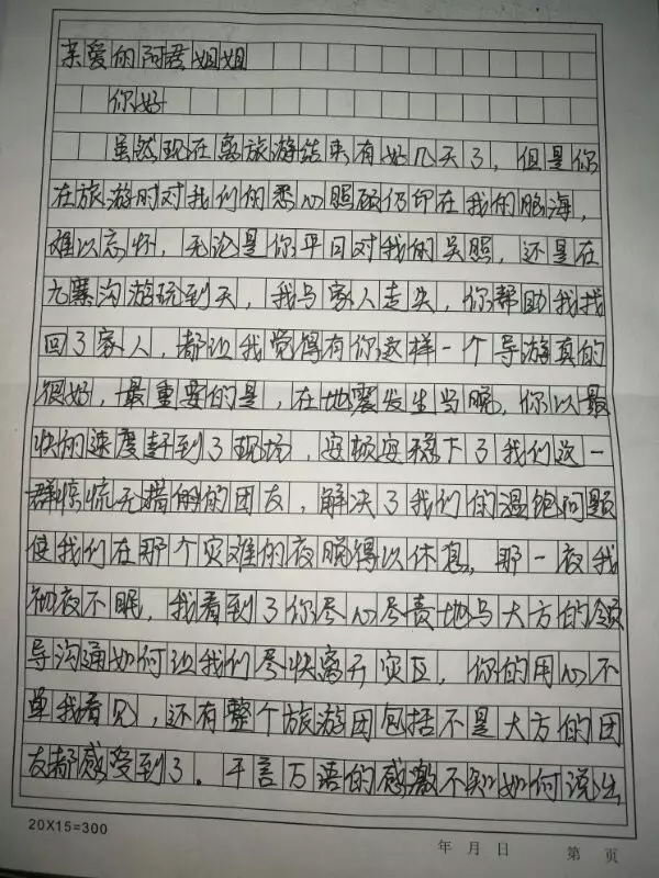 客人在感谢信中写道:“在地震发生当晚,你以最快的速度赶到了现场,安顿了我们这一群惊慌无措的团友,解决了我们的温饱问题,使我们在那个灾难的夜晚得以休息... 我看到了你尽心尽责地与大方的领导沟通如何让我们尽快离开灾区... 千言万语的感激不知如何说出...”