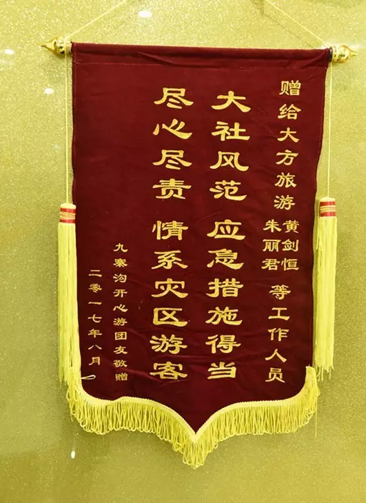 客人在锦旗上写道:“大社风范、应急措施得当;尽心尽责、情系灾区游客”。