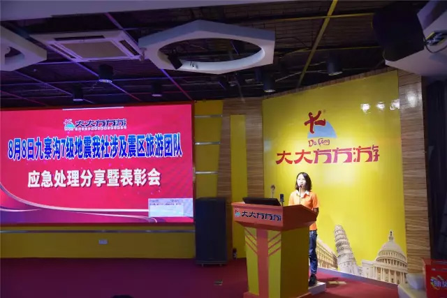 8月16日,大方旅游举行隆重的表彰大会,对导游朱丽君及本次应急小组成员进行通报表扬。