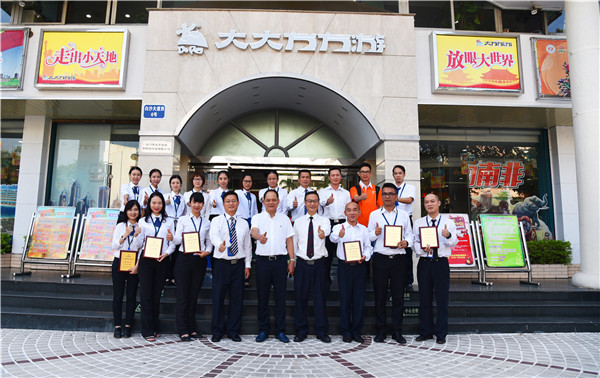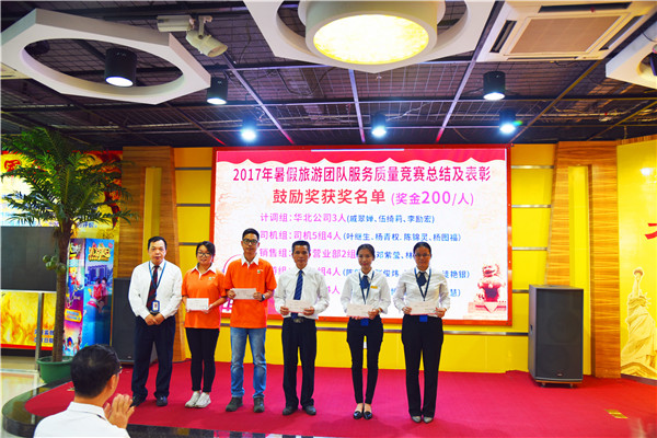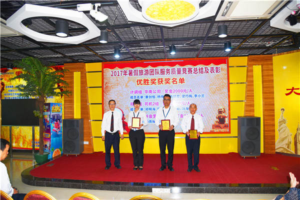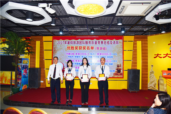 ▼大方旅游常务副总经理黄冠明上台颁发2017年暑假服务质量竞赛优胜奖奖牌。