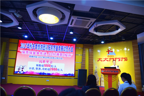 大会最后,常务副总经理黄冠明上台为秋冬季服务质量竞赛活动作总动员。“保质保量争先进,10分满意0投诉”,是大方旅游2017年秋冬旅游团队服务质量的目标,我们一定全力以赴,做到最好!