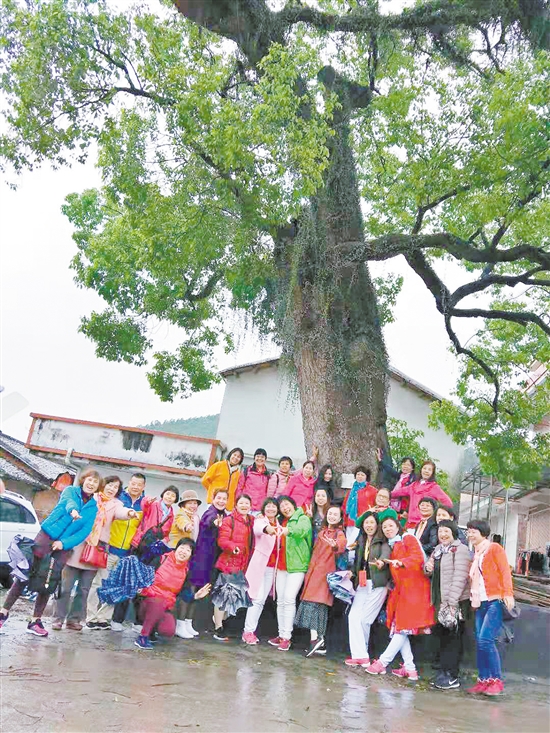 参观完文化馆,雨越下越大,可团友们游览的热情依然高涨,大家一致希望按照行程前往永乐村参观。永乐村是一个建于明朝之前的客家古村落,后因避讳明朝“永乐”年号,改名刘屋村。之后,又复名永乐村。村中有一棵高18米、直径1.8米,种植于明朝嘉靖年间,树龄超500年的古樟树。树木根深叶茂,伟岸壮观,与旁边一棵约250年历史的古樟树合称“父子树”。天公作美,到永乐村时,雨就停了。团友们都兴奋地跑去与超500年树龄的古樟树拍照合影,并全员大合唱,大家都表示玩得非常开心。