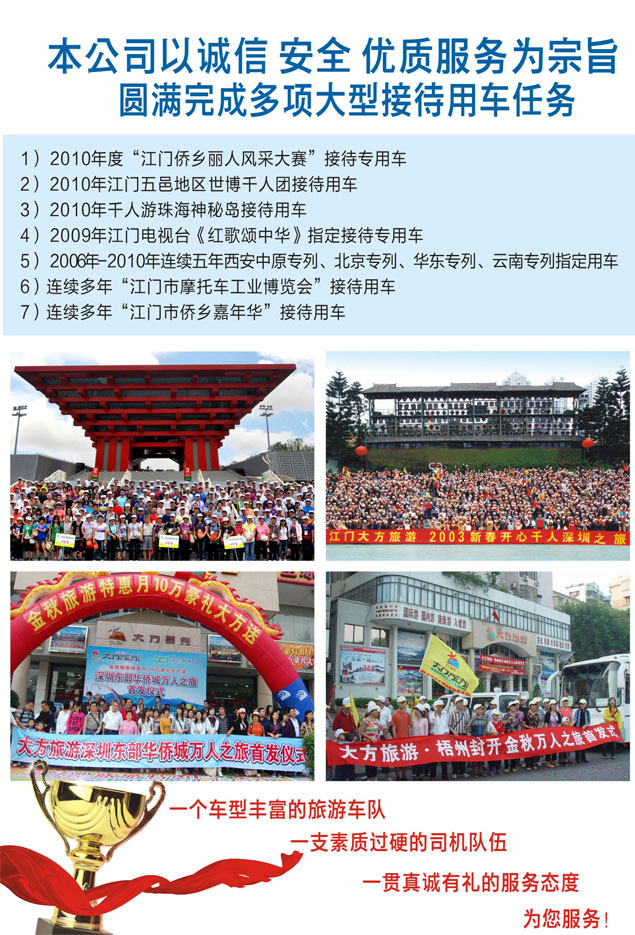 江门市大中旅游汽车服务有限公司成立于2002年。现有4 - 55座各种型号旅游汽车,车况至新,服务好。其中高级豪华大巴28台,超豪华商务大巴2台。